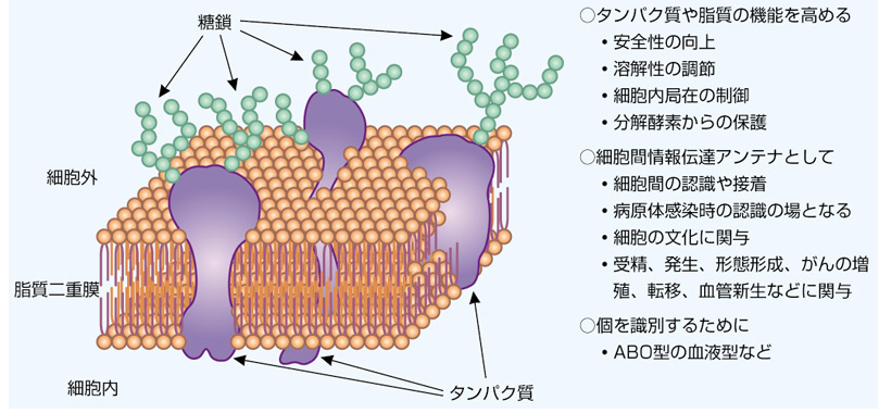 この糖鎖はタンパク質や細胞の膜を構成している脂質の表面に結合し、その働きを左右しています。